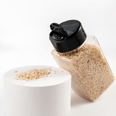إن أغطية زجاجات التوابل البلاستيكية هذه عبارة عن سطحين قلابين لهز أو سكب التوابل.